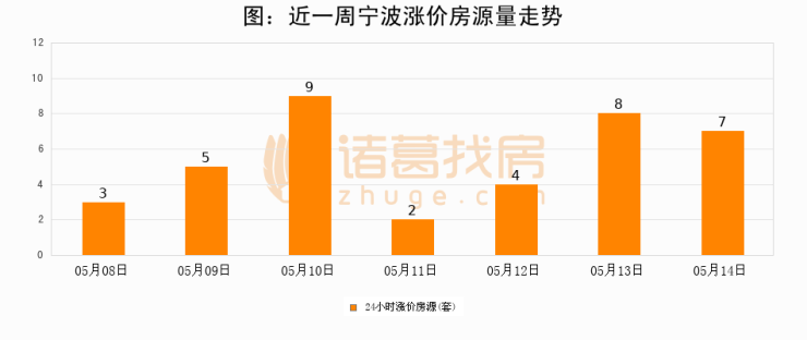 根据诸葛找房数据显示,宁波24小时涨价房源量为7套,较05月13日减少1套,环比下降12.5%。与此同时,涨价房源占比小幅回落,对于购房者来说是一个入市窗口期,购房者可抓住时机入市。