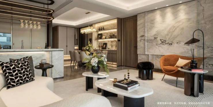 为一块奢石弧形工艺,投入翻倍的成本,整屋坚持用一种昂贵的木饰面贯通始终,从而实现整体艺术风格的统一。客厅背景墙的“烟雨江南”天然大理石,不同于传统平面背景墙,通过弧度及立体的造型处理,并镶嵌不锈钢材质,对于金茂而言,比奢石昂贵的,是让奢石真正与空间气场融为一体。空间的本质,归根到底是承载着生活的内容,在生活方式上,璞元亦在追求一种全新的理念,将更多空间赋予在客餐厅公区空间,倡导家庭成员的和谐、美好相处,这种源于国际视野的居住理念,亦缩影着璞元骨子里的“国际范”。