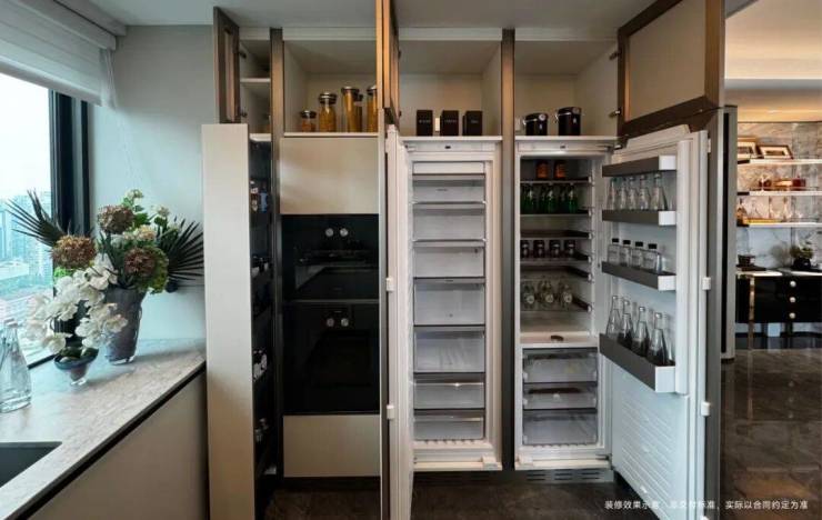 为使厨房成为「真正幸福之地」,璞元在各个细微之处倾注关怀,从地柜拉篮系统,到上柜系统,再到抽屉分格系统,浅抽与深抽搭配,让整个厨房空间,既百变,又充满秩序。厨房与餐厅打造半开放式格局,隐形推拉门既可以隔绝烟火,平时收入墙内让空间一体、开阔大气。定制橱柜为意大利高端品牌威乃达,实现家居健康的同时,兼具高奢品质。