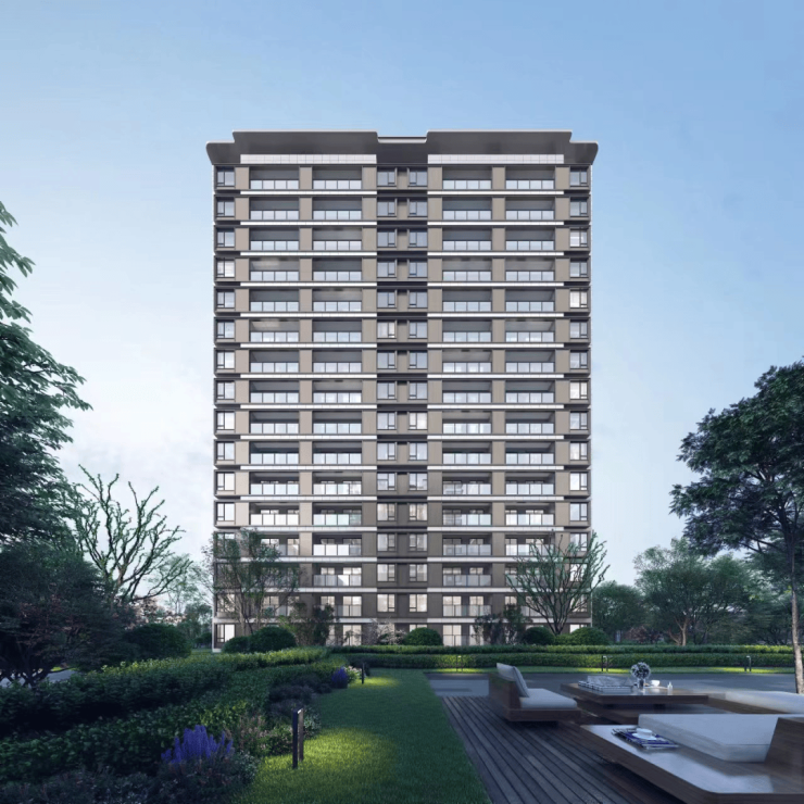 晶幕高层楼栋,采用公建化立面,极简现代风格,阔景阳台、大面积玻璃,端庄大气。