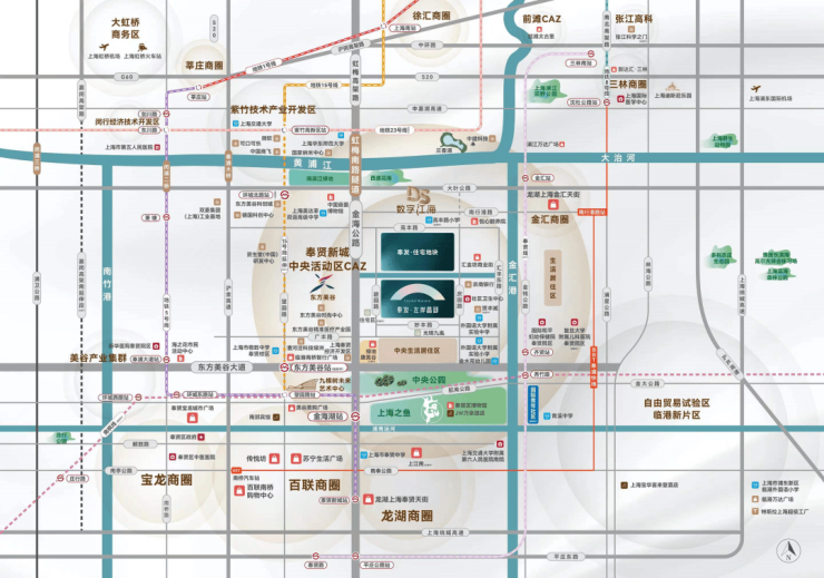 向南,依次坐落万亩中央森林公园、九棵树未来艺术中心、南上海体育中心(规划)、上海之鱼、龙湖奉贤天街......