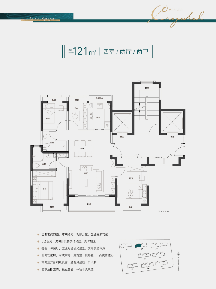约121平四室两厅两卫,三开间朝南,全卧飘窗,约4.8米面宽客厅,结合超大观景阳台,使客厅的空间感增强,采光效果更好,宽敞气派。
