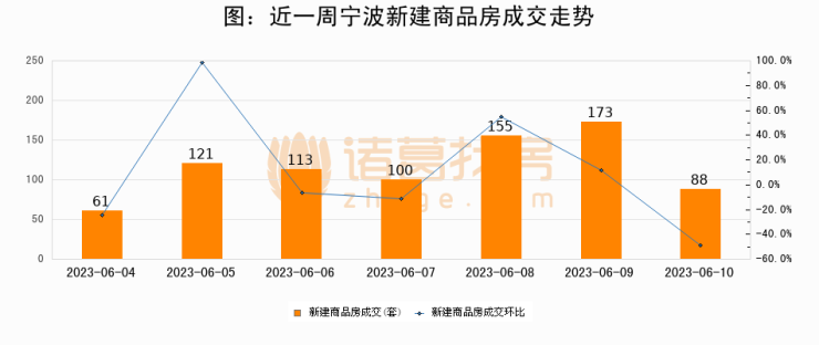 根据宁波市房产市场管理中心数据显示,2023年06月10日宁波新建商品房成交88套,较昨日减少85套,环比下降49.1%