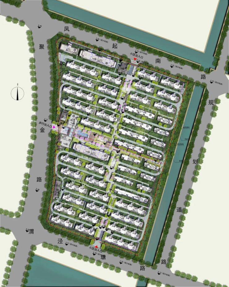 从总平图来看,项目有三个入口处,内部植被绿化丰富,部分楼栋可观河景。