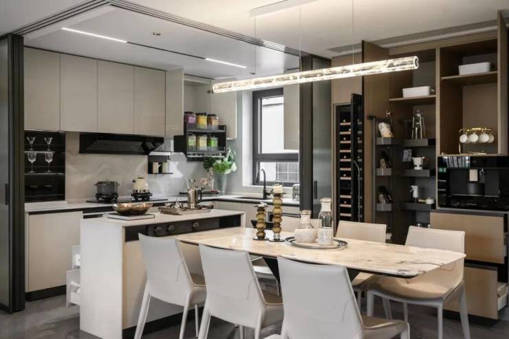 招商时代乐章艺术化的再造传统餐厨空间,可开可合的岛台设计,结合艺术玻璃移门,在提升空间灵动性的同时,也激发出餐厨空间生活的多样性。