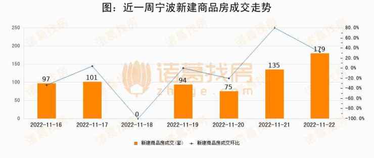 根据宁波市房产市场管理中心数据显示,2022年11月22日宁波新建商品房成交179套,较昨日增加44套,环比上涨32.6%