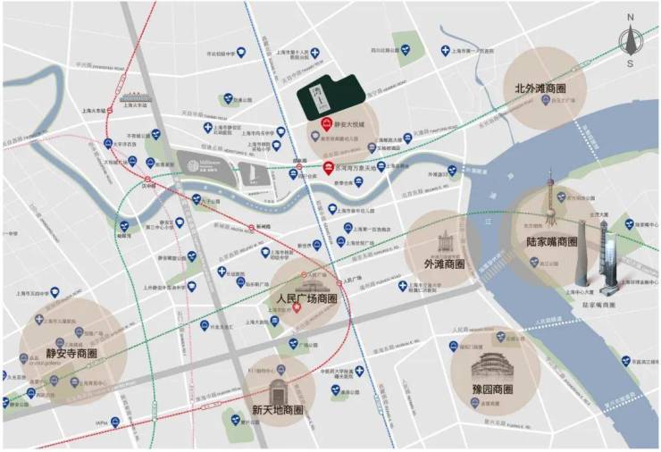 首先,从地图上来看,项目直线距离人民广场仅约1.5公里,外滩、南京东路和南京西路都在2公里范围之内!这也就意味着,上海绝大部分核心的城市地标、商业配套和文化资源全都步行可至,宛如自家的配套!