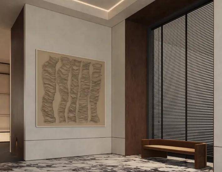 项目采用地上+地下三层同标准精装入户大堂,一楼大堂层高约6.6米,大堂选用有着媲美艺术品表现力的亚马逊绿天然奢石,结合仿古铜不锈钢、艺术壁灯为点缀,将上海的摩登气息注入归家大堂,给业主更强烈的入户仪式感。