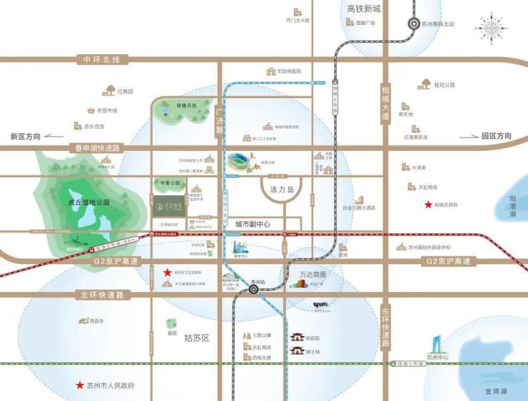 相城是苏州对外的枢纽地,享受苏州北部发展红利,活力岛板块近邻姑苏平江板块,承接主城外溢资源。多重机遇叠加,擘画活力未来。