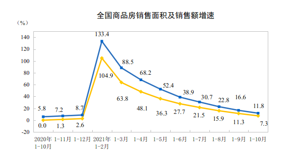 与房地产开发投资增速同时下降的,还有商品房销售面积、销售额。据国家统计局数据显示,1-10月,商品房销售面积14.3亿平方米,同比增长7.3%;商品房销售额14.72万亿元,同比增长11.8%。