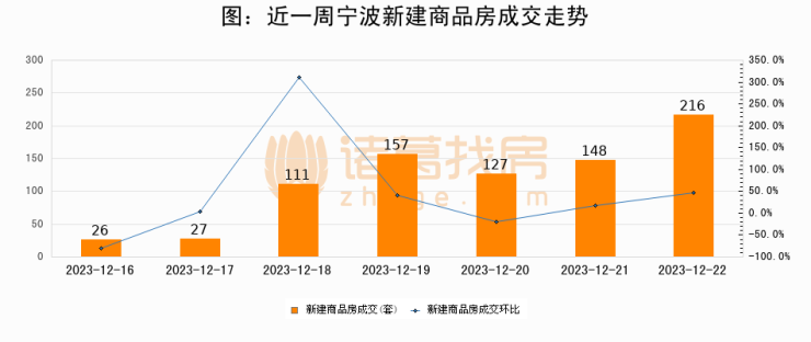 根据宁波市房产市场管理中心数据显示,2023年12月22日宁波新建商品房成交216套,较昨日增加68套,环比上涨46%