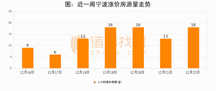 根据诸葛找房数据显示,宁波24小时涨价房源量为18套,较12月21日增加5套,环比上涨38.5%。与此同时,涨价房源占比小幅扩大,业主信心有所提升。