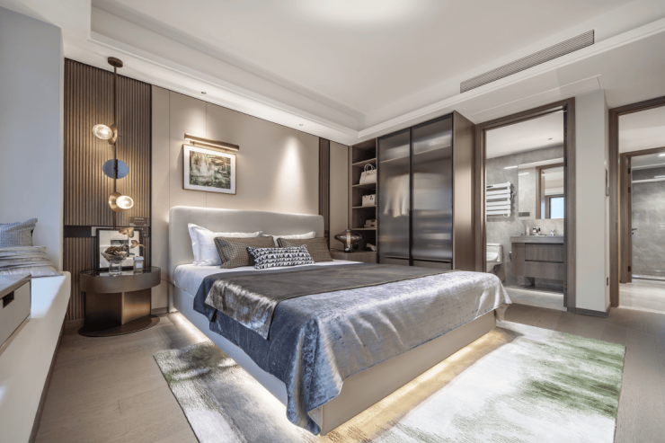 交付标准:精装交付,配备东芝中央空调、中科睿赛新风系统、威能地暖三大件;厨房配置老板烟灶、12件套洗碗机、摩恩水槽龙头;卫浴采用科勒洁具,全屋定制收纳系统
