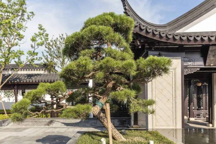 门口以百万黑松迎宾,彰显仪态万千,又选取了硕大的湖石平躺在照壁之下,与黑松相得益彰。借鉴四大园林中的“狮子林”布局门户,寓以照壁、松、石,体现居者的身份与贵气。