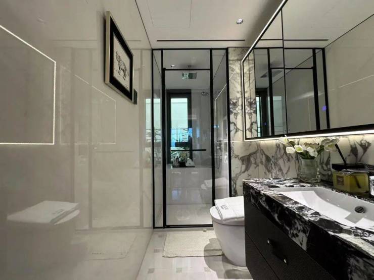 ✔卫生间地面和墙面整体性也非常强,奢石台面的纹路和岩板墙面和协调。
