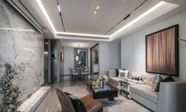 整体效果现代精致,十分符合当下年轻人的审美观;星级酒店式入户门,挑高约7米,宽约60米;石材金属线条背景墙加暖色系夜灯搭配,中庭花园水岛层叠、景墙错落,槭树青红间季节流转的温情脉脉展现,精致的水景让居住者仿若初入剧宴,感受剧目的艺术呈现……