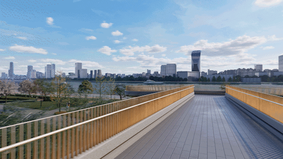 未来业主无需计划、无需过马路,在会所入口买一杯咖啡,电梯到二楼大堂后,通过闸机、穿过廊桥就是江面,真正实现“零障碍漫步归江”。