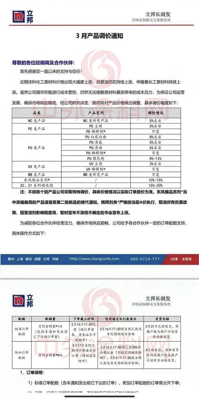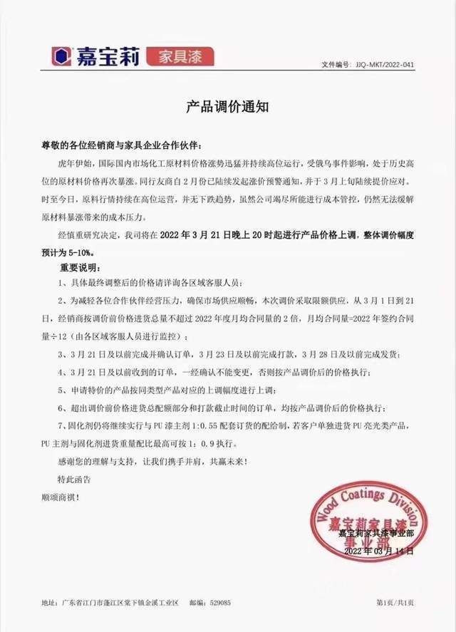 同时,为应对开年以来原材料价格暴涨,3月14日,嘉宝莉家具漆事业部发布产品调价通知称,预计将于3月21日晚20时起,上调产品价格5-10%;美涂士家具漆事业部也表示,将于2022年3月15日0时起,上调产品价格5%-15%。