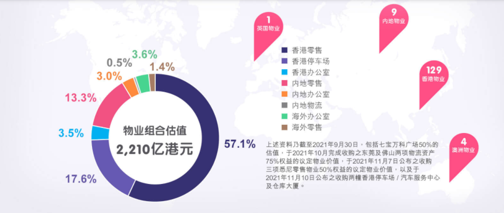 据其官网介绍,公司旗下物业共143个,组合价值2,210亿港元,成立以来共发生约670亿港元的并购。