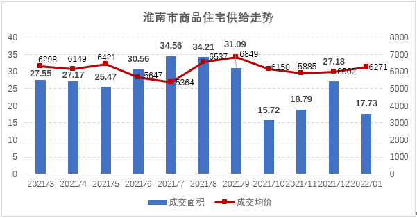 而新房方面,新京报记者了解到,目前淮南市在售新建楼盘的价格在5000元-9000元/平方米之间,市中心的新房总价基本在60万-100万之间。来自58安居客房产研究院统计数据显示,2022年1月,淮南市商品住宅成交面积为17.73万平方米,环比减少35%,持续在低位徘徊。价格方面,1月淮南市商品住宅成交均价为6271元/平方米,环比上涨4%,已连续两个月上涨。