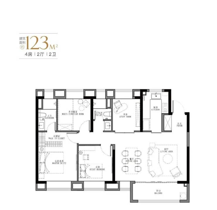 户型设计:103-107㎡3房采用3.5开间朝南+大横厅设计,123-129㎡4房南向尺度媲美别墅