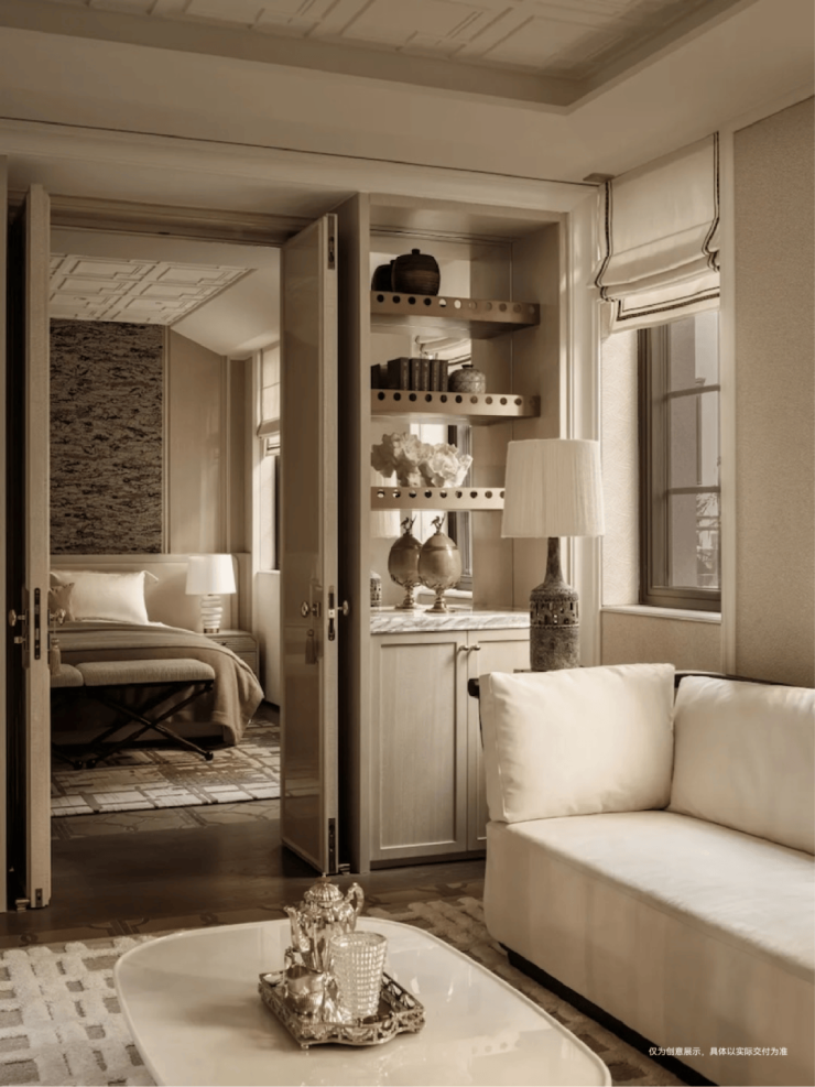 契合中国传统院落居住哲学理念,以“外紧内松”空间设计手法,对风貌别墅空间尺度进行当代拓新,让空间服务于生活。外紧-通过外部百年巷道肌理活化、建筑错落排布景筑交融,打造美而精的体验;内松-宅院内以多重庭院、立体花园、大落地窗等实现室内尺度拓新,给家人更多停留空间、打造建筑会呼吸的松弛感。