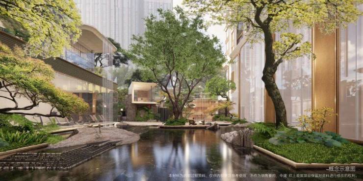 中建玖上琅宸以豫园为灵感,建设一了座当代山水隐园。在社区内部,遵循豫园山脉、水脉,以现代化手法表达,形成立体的山水园林景观,包括立体的山林、引水入园、庭荫树影。