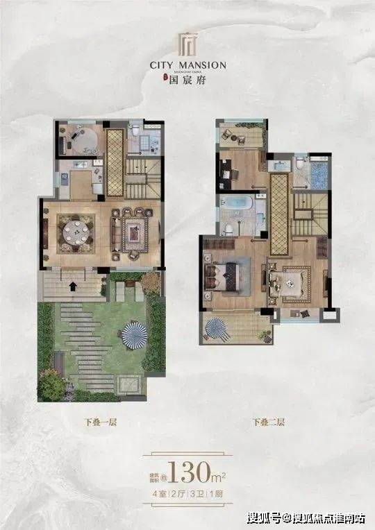下叠:1-2层130平,有花园和地下室