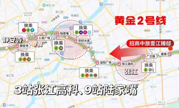 轨交动脉:2号线3站张江高科,9站陆家嘴,连缀包括嘴、南京东路、人民广场、南京西路,贯通4个国际商务区,南北互连两大国际机场和虹桥火车站,“奢华”程度不言而喻。