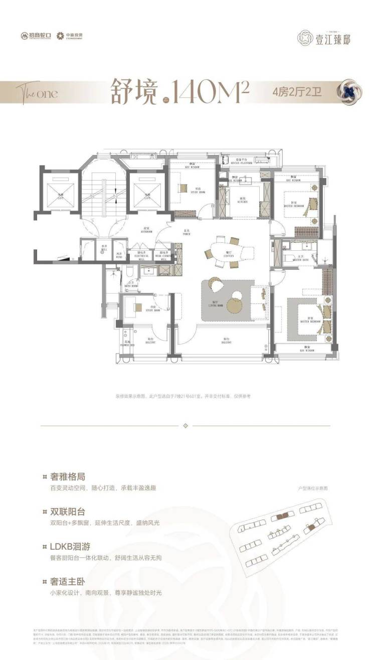 但事实上,壹江臻邸建面约140㎡的实际使用率做到了约95%,双阳台+双约270°视野+类一梯一户独立电梯厅+多飘窗。