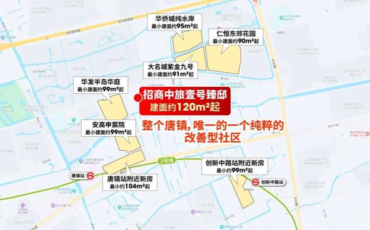 首先,它择址唐镇环境最好、圈层最高端的富人区,北面的三大顶级别墅区,起步总价就是约2500万+。