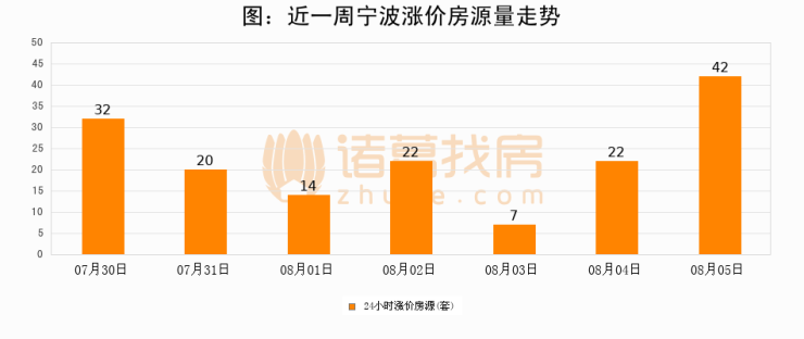 根据诸葛找房数据显示,宁波24小时涨价房源量为42套,较08月04日增加20套,环比上涨90.9%。与此同时,涨价房源占比小幅扩大,业主信心有所提升。