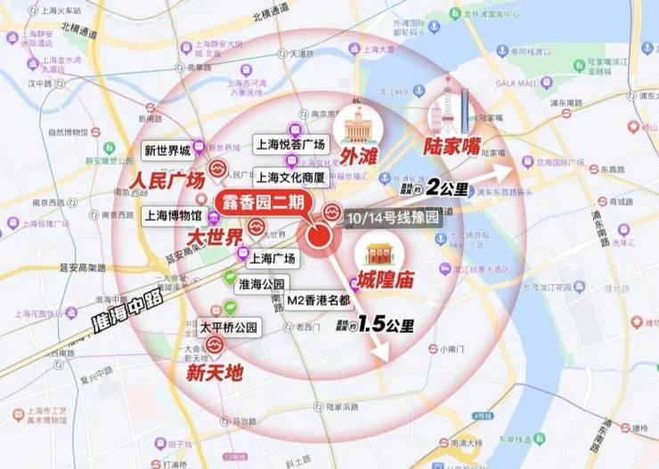 作为上海的绝对市心,露香园直线距离人民广场、淮海路、外滩、豫园等上海市地标性区域均不超过1.5公里,距离陆家嘴直线约2公里。