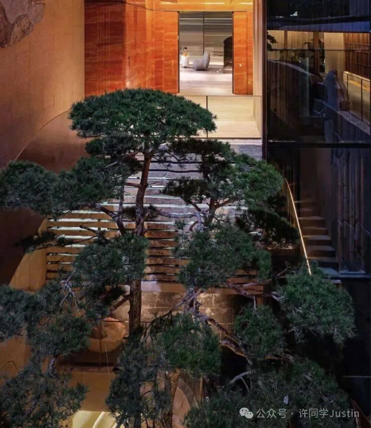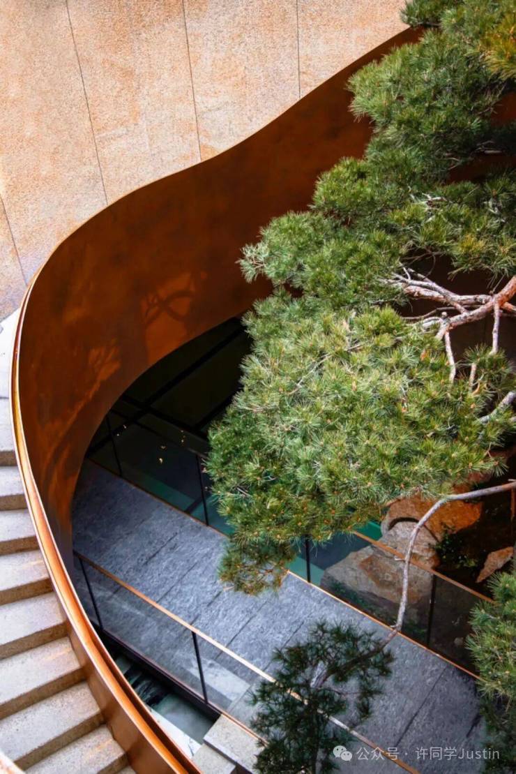 顺着旋梯而下,地下一层高约8米的双杆孪生连理松,与墙面上的原生山石皮,在你身旁环绕成了层峦叠嶂的意象。