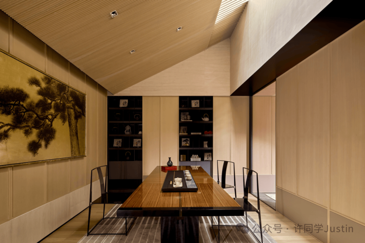会所里还藏着一个超长的私宴厅。你可以在这里品酒,也可以在这里品茗,可以闲聊,也可以打掼蛋或者打麻将,这里还可以滋生出一场很日常的聚会,这些功能空间,全都是与私宴厅一体化设计的。