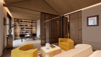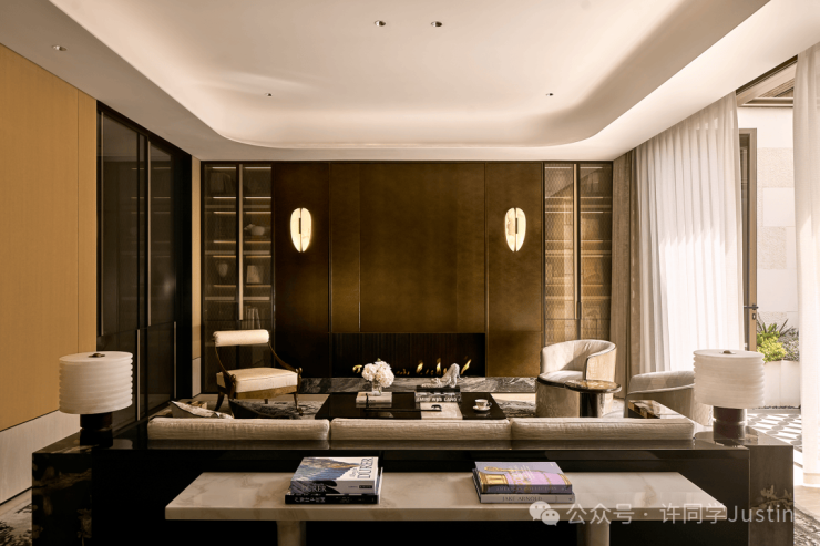 透过瀑布湍流的天光庭院,你在泳池里就可以看到会客厅中家人相伴的身影。会客厅沙发背后的镂空转角奢石景墙与金属屏风,不只是装饰品,它让会客厅与背后奢华的大堂吧隔而不离。你可以透过它,看到吧台的透光奢石景墙。