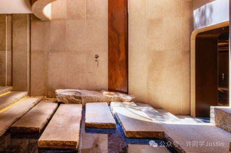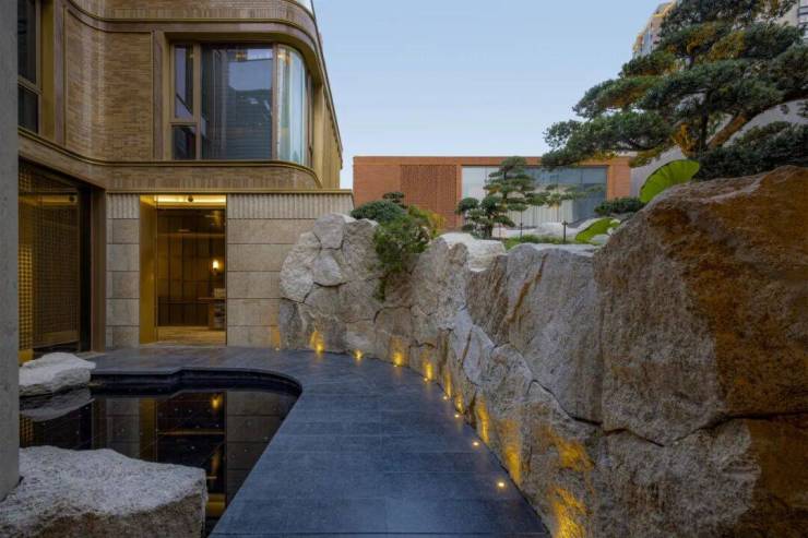 他们在庭院中引入了一条水系,不是平铺在地面上,而是让水流在墙面上垂直流淌。它出现在地下一层的旋梯上,地下二层的庭院中,汇聚到了地下三层的会所。