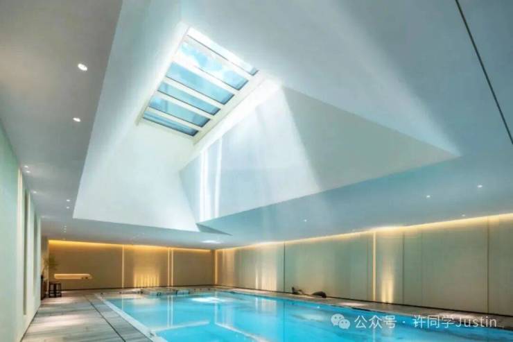 室内恒温泳池一端设计了很有古典气息的奢石涌泉,形制复刻自古罗马浴场。泳池的上方设计了珍贵的自然采光,阳光投入碧波,会给你带来「天光水影共徘徊」的美好感受。