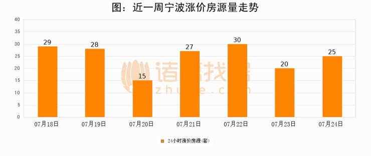 根据诸葛找房数据显示,宁波24小时涨价房源量为25套,较07月23日增加5套,环比上涨25%。与此同时,涨价房源占比小幅扩大,业主信心有所提升。