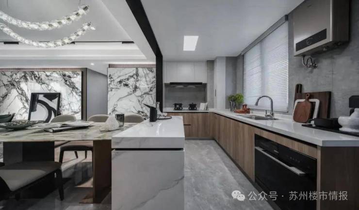 当步入LDKB社交会客厅,纯净的线条将餐厅、客厅、厨房、阳台融为一体,四大工区保持在一条直线之上,窗外即是园林盛景,让厅的意义不局限于视野、采光,真正做到了家庭休闲、社交会客、亲子互动等各类场景。