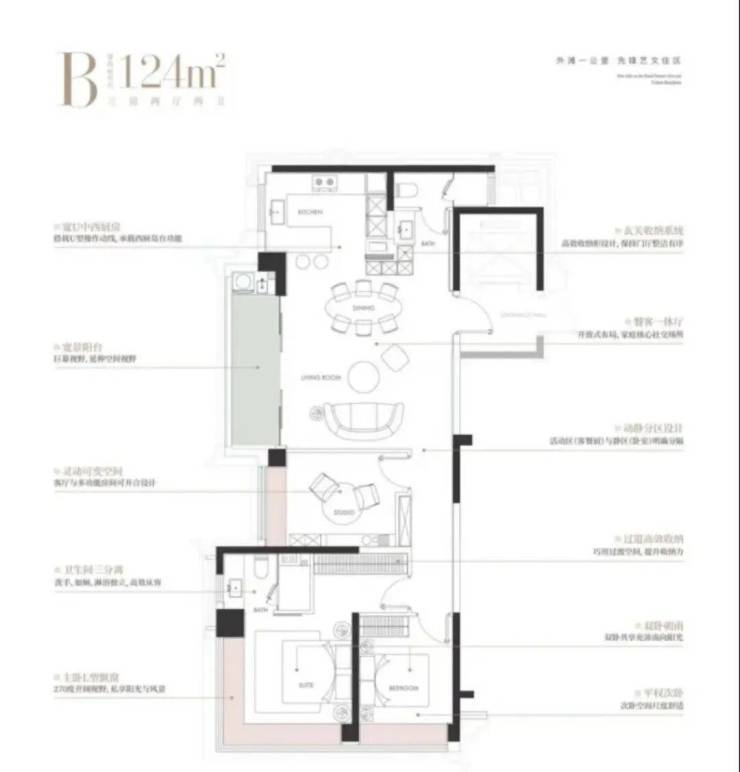 建面约124㎡的边厅“全景舱”户型,是外滩板块极致稀缺的臻品。它以三房布局满足主流家庭需求,更以无遮挡的视野与巨幕般的边厅落地窗,将城市天际线化为私藏画卷。主卧270°L型飘窗,让阳光与风景成为生活的主角。