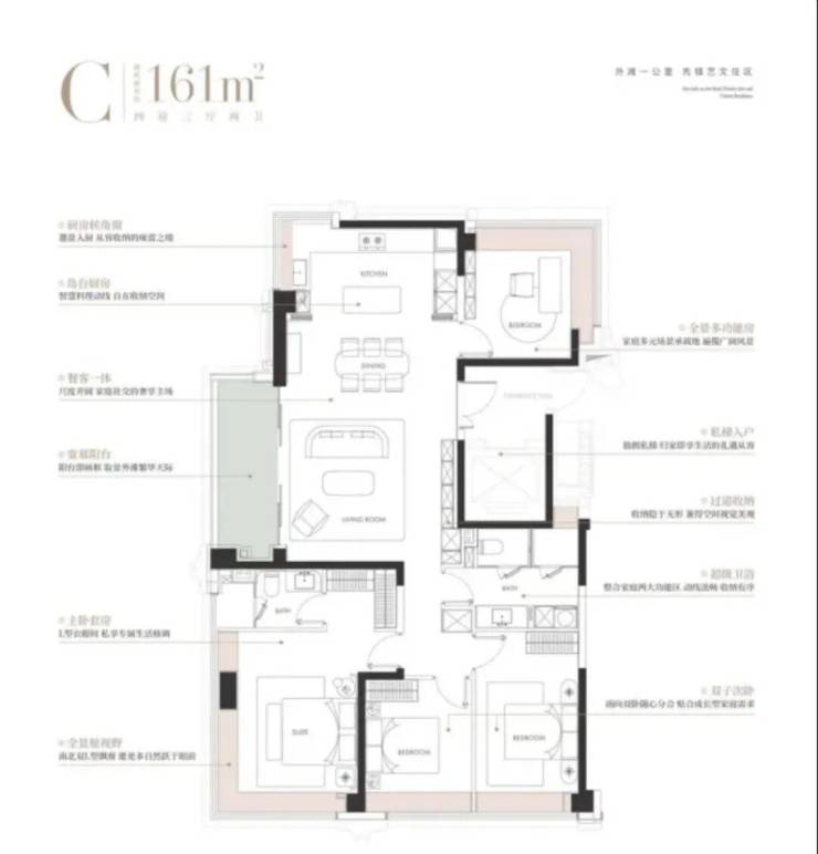 建面约161㎡的奢享四房,则是对改善需求的深刻洞察。其设计更是颠覆性的:全屋四个转角窗构建外滩天际环幕视野,三卧朝南且近乎等面宽的“真四房”设计,实现了家庭成员间的景观平权与舒适平权。酒店式四分离次卫与独立家政空间的设计,更是对生活细节的极致考量。