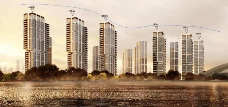 建筑方面,项目为实现视野民主化,临江楼栋向南偏转32.5°,将约400米沿江界面延展为纵深2公里的瞰江长卷。高区视野由此豁然开朗,将黄浦江的壮阔全景,收纳为每日生活的流动背景。