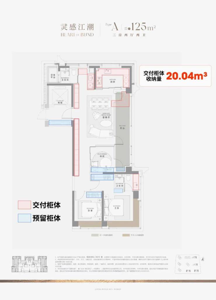 据小胖君手工统计,项目125㎡3房边套户型的整体交付柜子+预留衣柜,收纳空间可以达到约20.04m³,中间套户型也能达到约16.56m³!