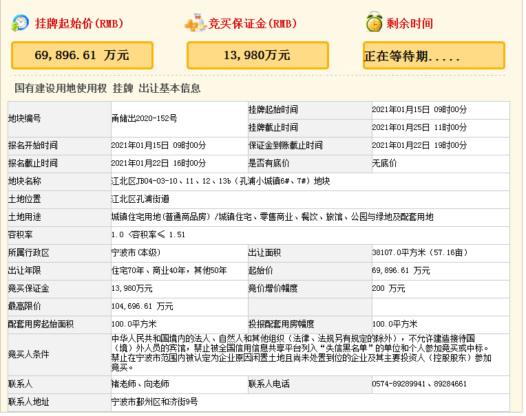 2、当竞买报价达到104696.61万元时,不再接受更高报价,转入竞报人才安居专用房程序,并按投报面积较高者确定竞得人。竞配的人才安居专用房(含人才安居专用房对应比例的停车位)按照《宁波市人才安居专用房筹集管理办法(试行)》移交政府代持机构。
