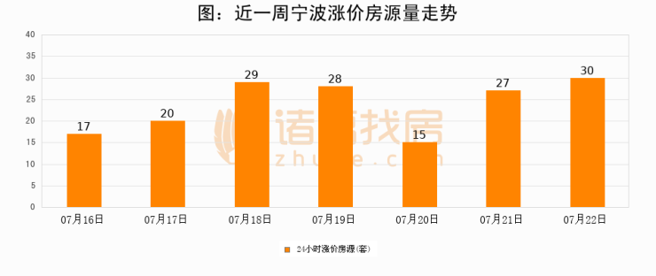 根据诸葛找房数据显示,宁波24小时涨价房源量为30套,较07月21日增加3套,环比上涨11.1%。与此同时,涨价房源占比小幅扩大,业主信心有所提升。