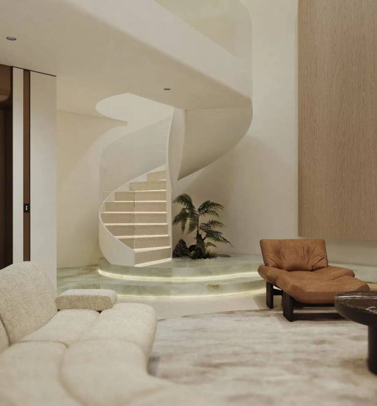 挑高的客厅里,白色旋转楼梯如月光下的丝带,轻盈盘旋而上。