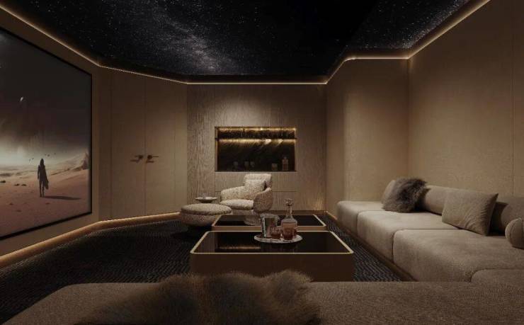 隐藏式灯带勾勒空间轮廓,壁灯、吊灯如星光洒落,夜晚降临时,
