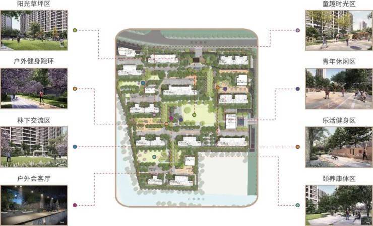 以中心绿地广场为基底,“林下交流区、户外会客厅”等丰沛社群主题空间为点缀,兑现阳光与生活的随心互动,以有限空间无限延伸生活宽度,以沉浸式场景构建一个对话思想、圈层共叙、精神放弛的乐活世界。
