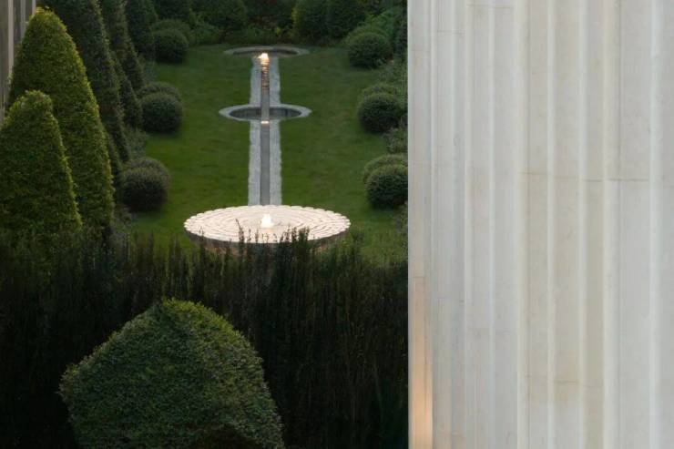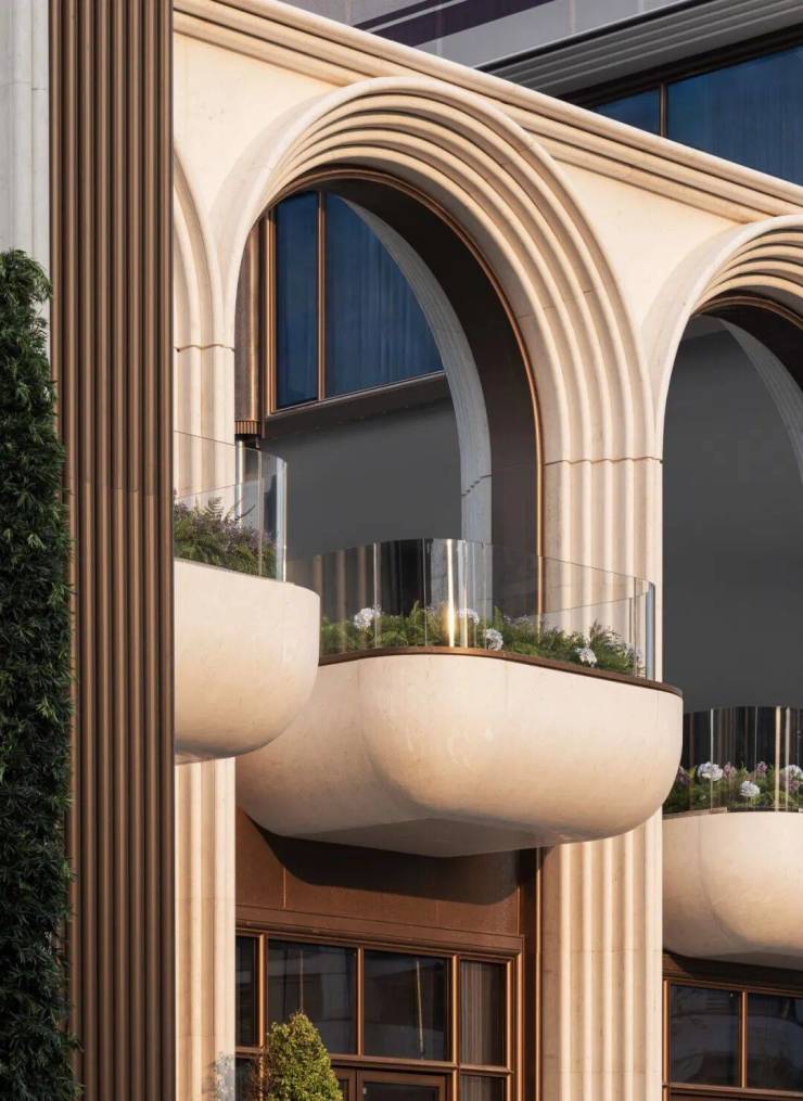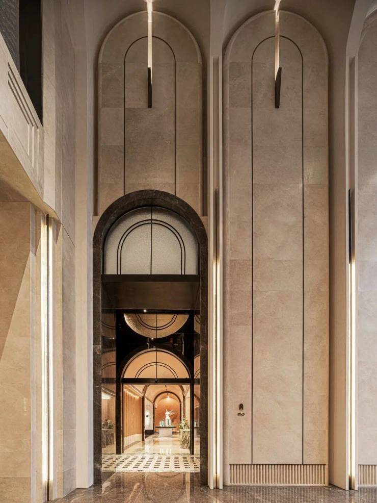 平权、均好、实用,贯穿明庐产品设计的始终。标志性的全抬地规划,从容托举整个社区,让明庐成为运河岸上悬浮的绿洲。从城市视角望去,高约12米的阵列式拱门,以大面积贝金米黄与宝格丽绿奢石为主材,演绎斯卡帕叠级的秩序韵律,让建筑在曲直之间,友好融入周边界面。
